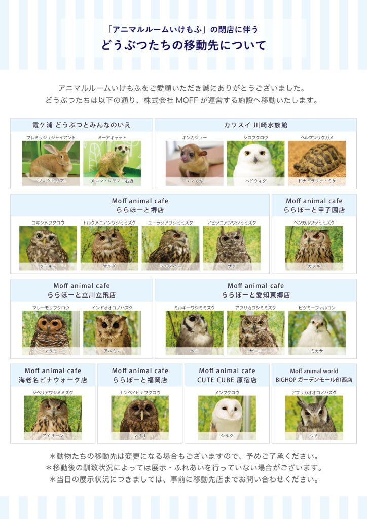 「アニマルルーム いけもふ」から移籍するどうぶつたちの詳細な移動先店舗は下記の通りとなります。